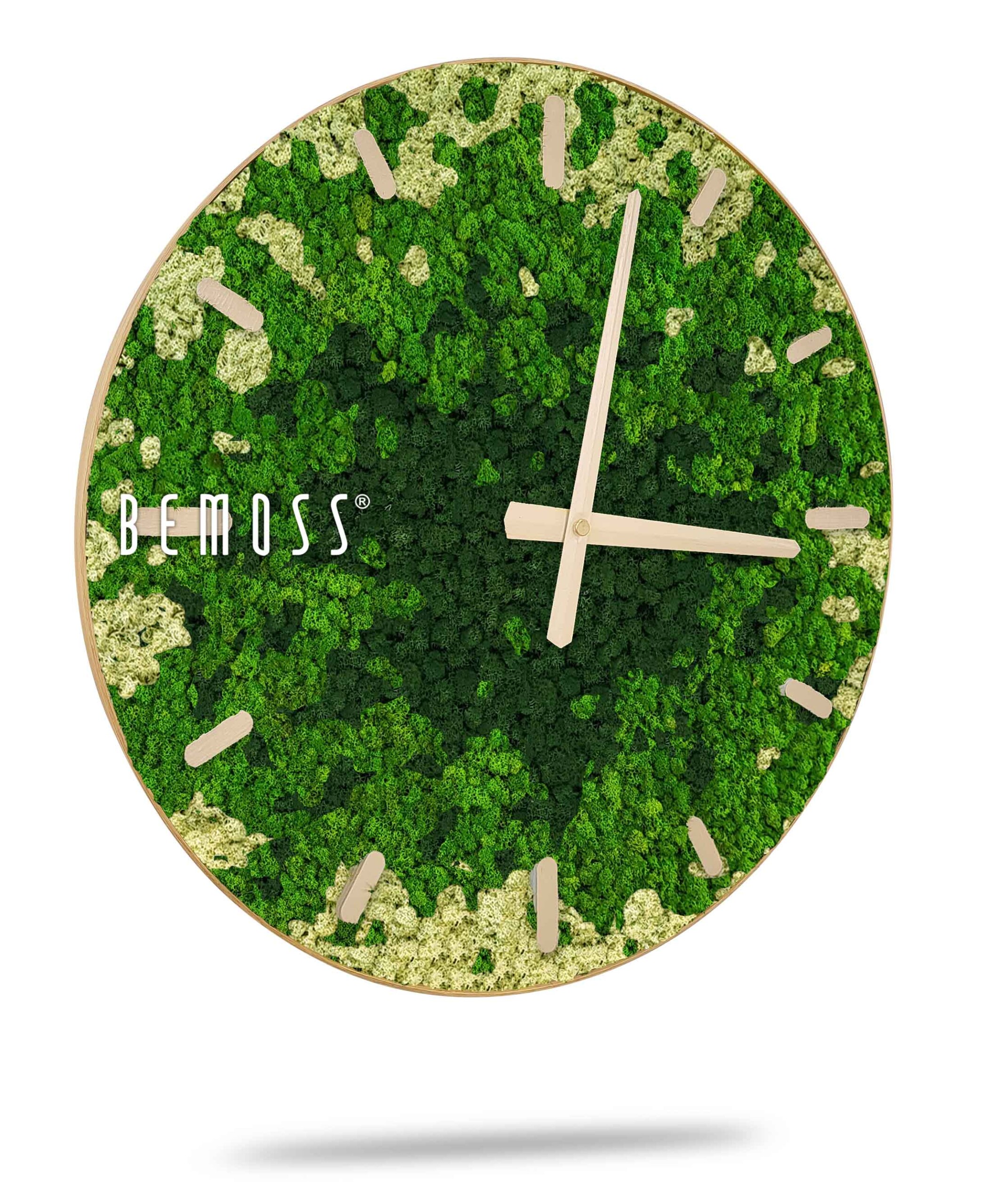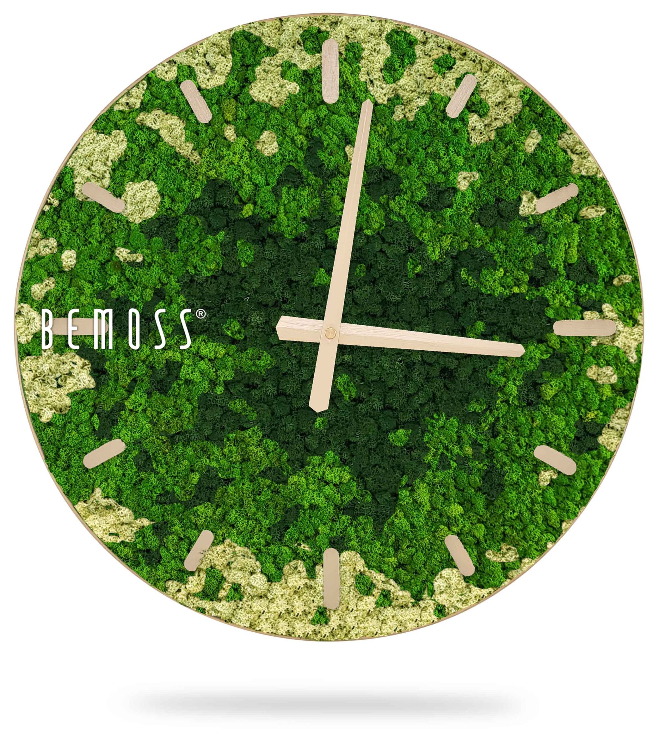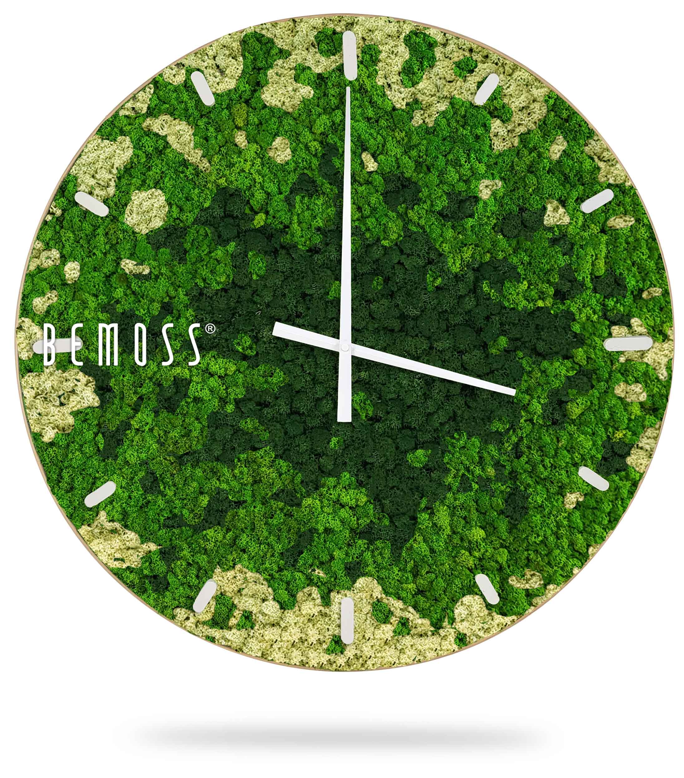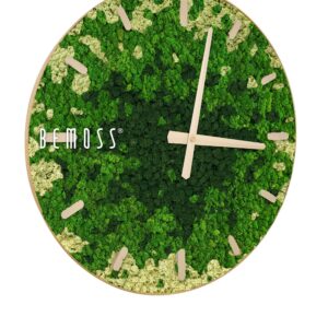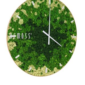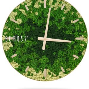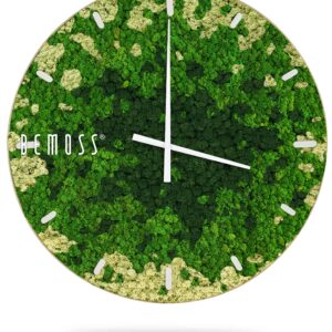 Machové hodiny BEMOSS® SPLASH Green s ciferníkom spájajú jedinečnú krásu prírody so štýlovým dizajnom, ktorý oživí každú miestnosť. Povrch hodín tvorí 100% prírodný stabilizovaný mach, ručne spracovaný na Slovensku. Zelené a béžové tóny machu pripomínajú upokojujúcu atmosféru lesných porastov, pričom hodiny sú dostupné s ciferníkom vo farebných variantoch podľa vašich preferencií.
