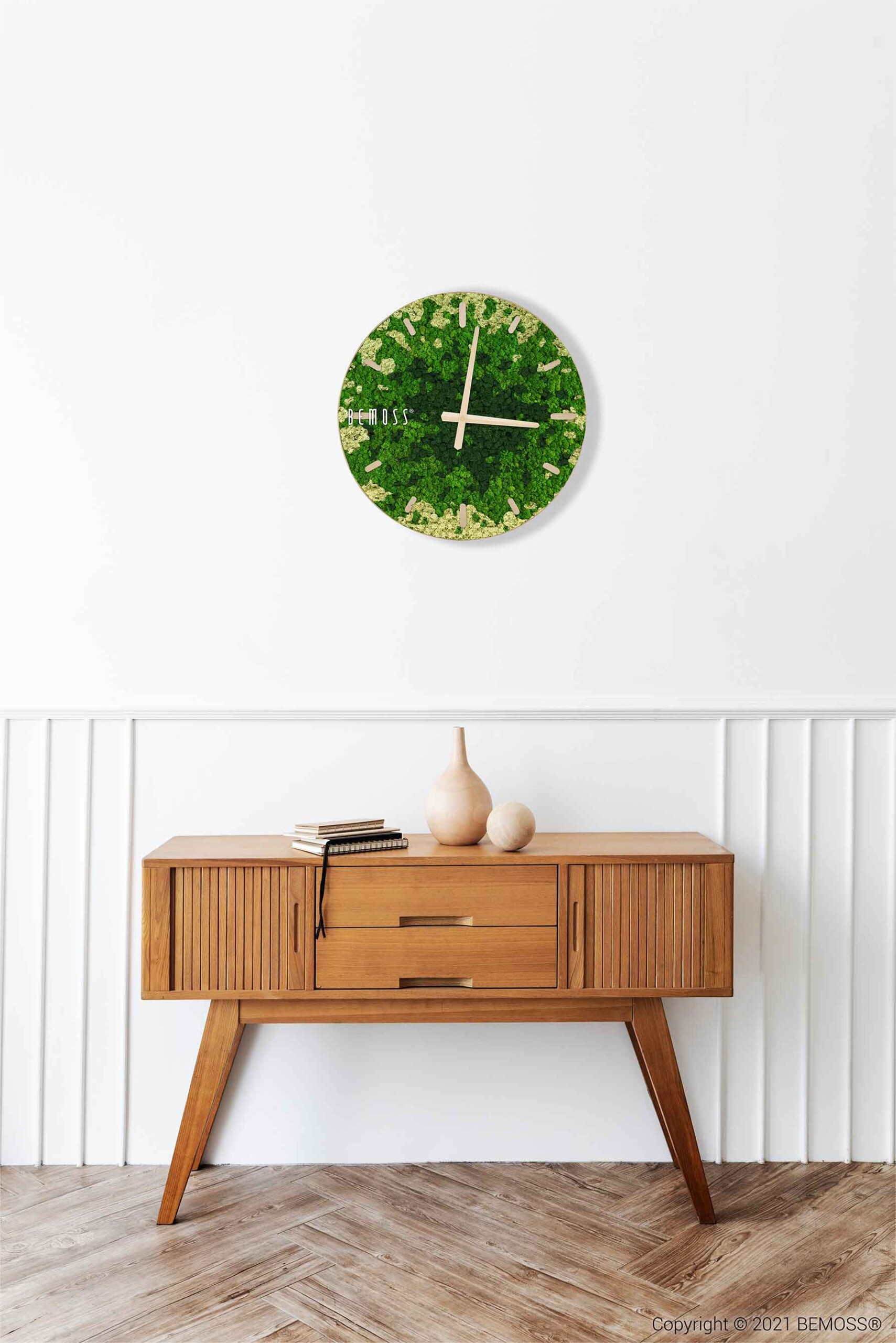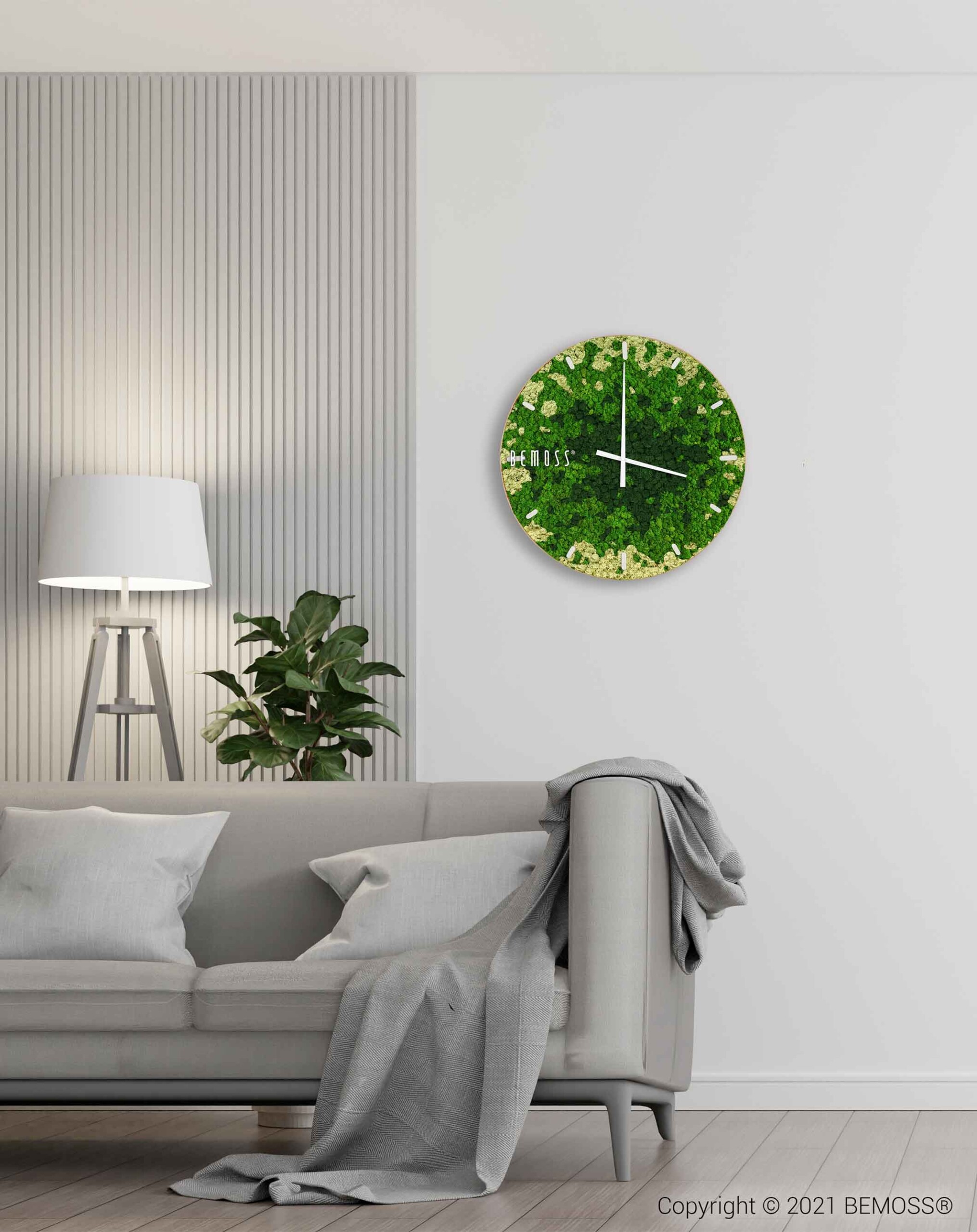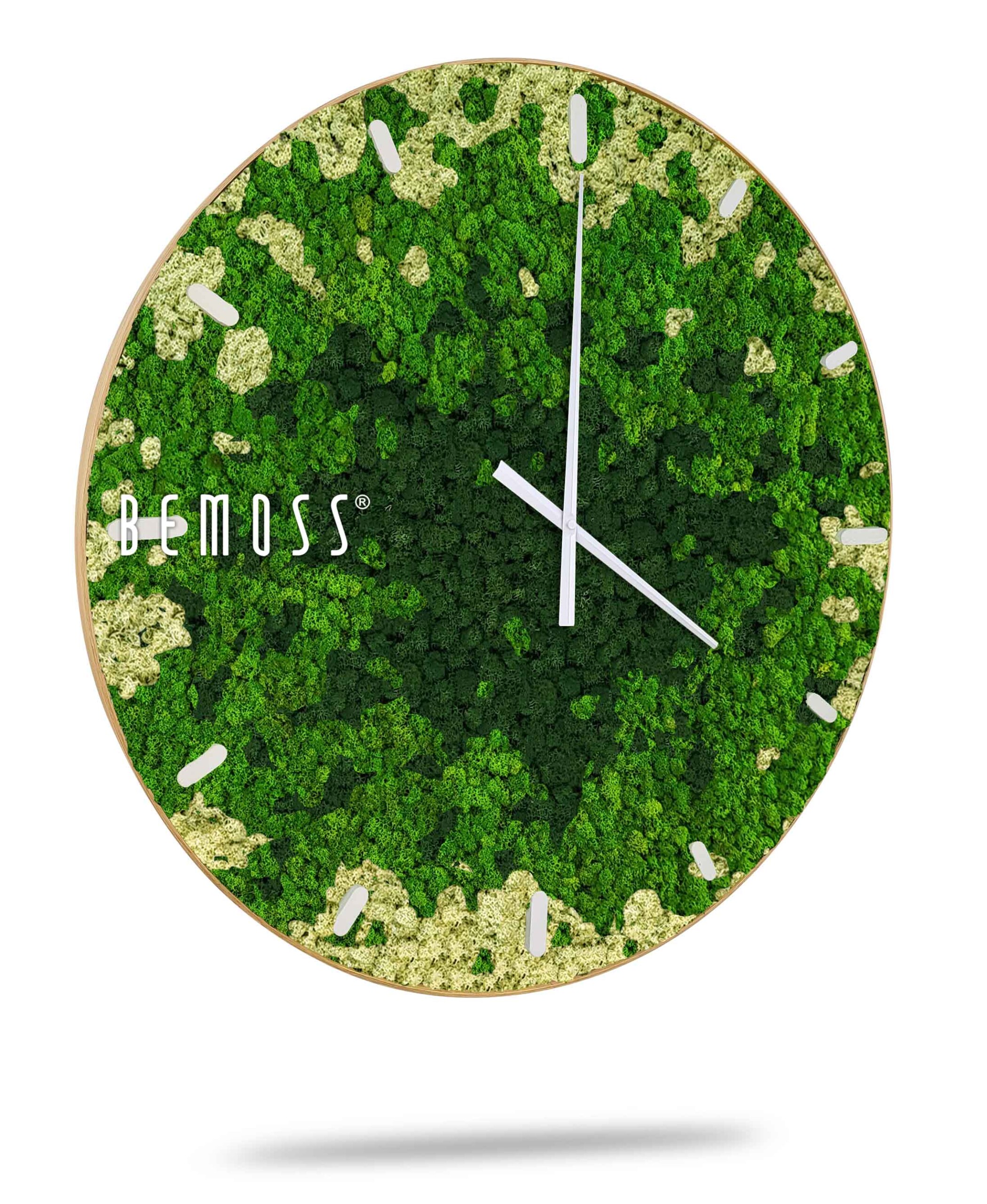 Machové hodiny BEMOSS® SPLASH Green s ciferníkom spájajú jedinečnú krásu prírody so štýlovým dizajnom, ktorý oživí každú miestnosť. Povrch hodín tvorí 100% prírodný stabilizovaný mach, ručne spracovaný na Slovensku. Zelené a béžové tóny machu pripomínajú upokojujúcu atmosféru lesných porastov, pričom hodiny sú dostupné s ciferníkom vo farebných variantoch podľa vašich preferencií.