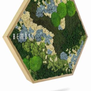 Machový Hexagon BEMOSS® ORTHO ICE je dostupný v typizovaných rozmeroch, no radi vám ho prispôsobíme na mieru podľa vašich predstáv. Prírodný drevený rám dotvára celkový dojem a umožňuje ľahké začlenenie obrazu do moderného či klasického interiéru.