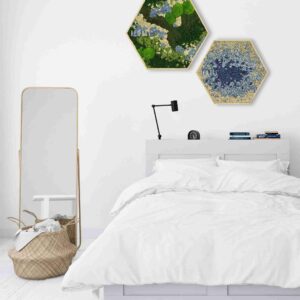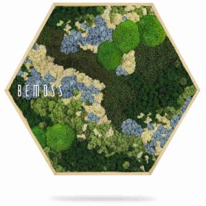Machový Hexagon BEMOSS® ORTHO ICE predstavuje fascinujúci prírodný dizajn, ktorý kombinuje jemné odtiene tmavozelenej, svetlozelenej a krémovej s chladnými akcentmi ľadovej modrej. Táto harmonická paleta farieb evokuje pocit pokoja a čerstvosti, pričom machové štruktúry vytvárajú vizuálnu hĺbku a jedinečný vzor. Dizajn hexagonálneho tvaru dodáva obrazu moderný a elegantný vzhľad, ktorý sa hodí do akéhokoľvek interiéru.