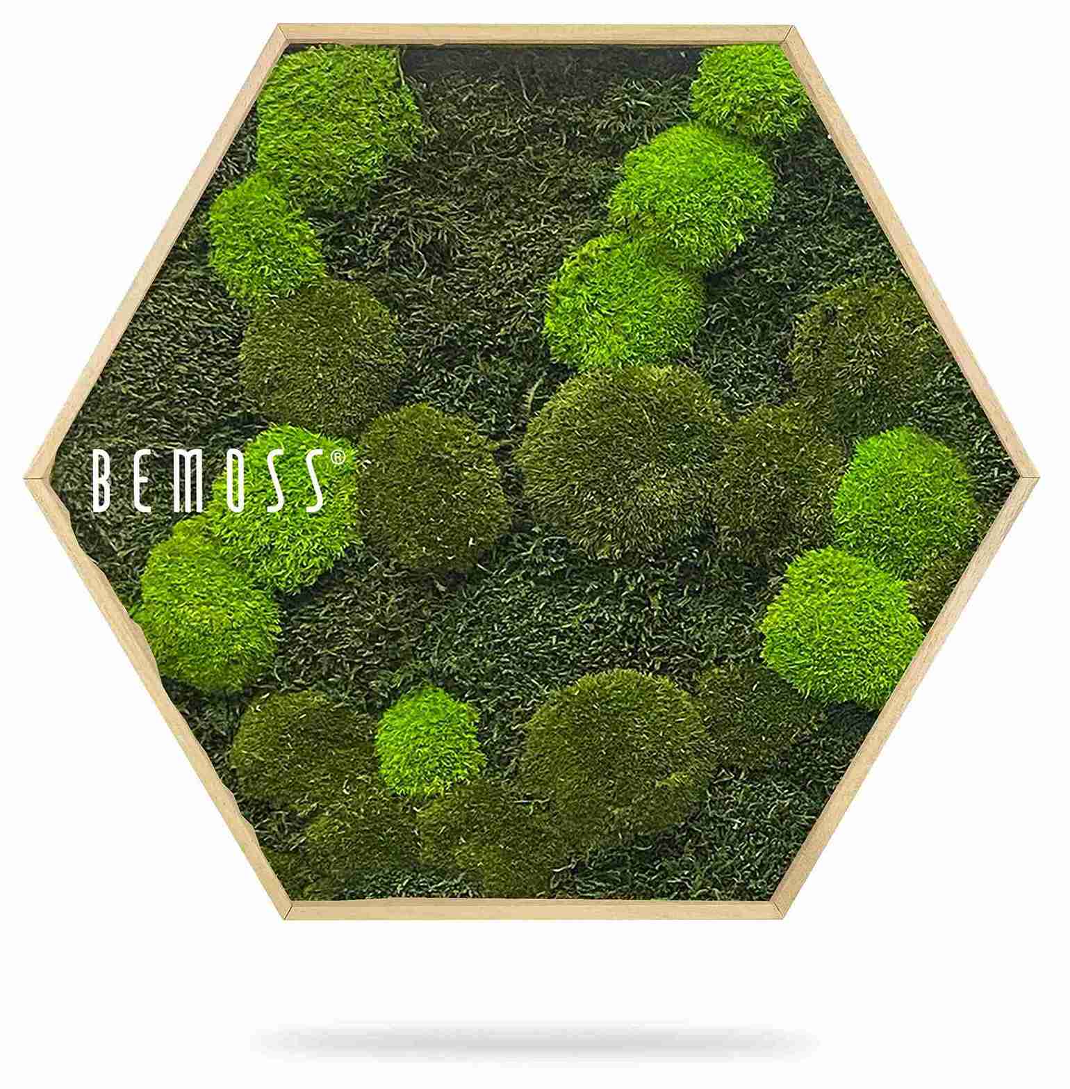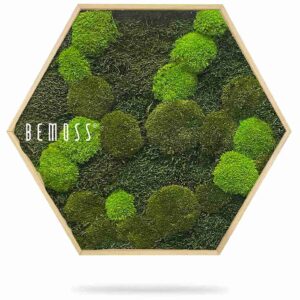 Machový hexagon FLATMOSS & BOLMOSS Doven mono predstavuje štýlové spojenie prírody a moderného geometrického dizajnu. Šesťuholníkový tvar dodáva obrazu dynamiku a umožňuje jeho kreatívne kombinovanie do väčších zostáv. Plochý a kopčekový mach v jednotnom zelenom tóne vytvára prirodzený reliéf, ktorý pôsobí elegantne a zároveň upokojujúco.