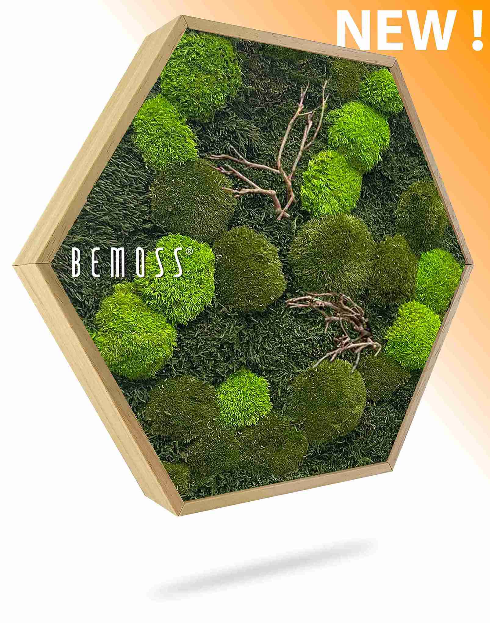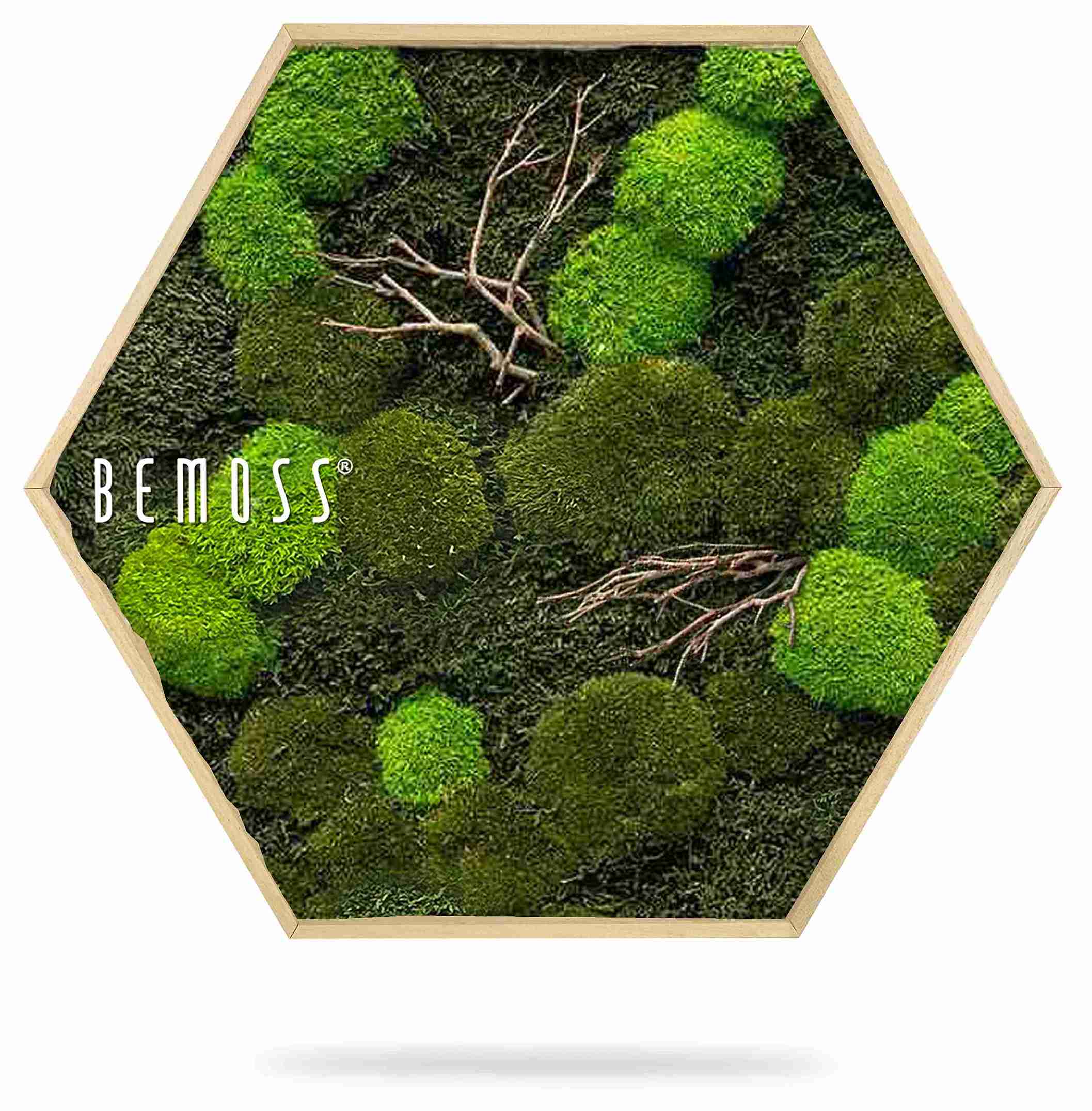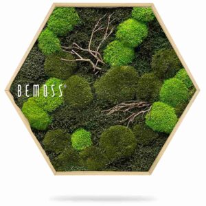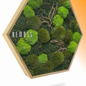 Machový hexagon FLATMOSS & BOLMOSS Doven WOOD prinesie do vášho interiéru moderný geometrický prvok s prírodným charakterom. Kombinácia plochého a kopčekového machu doplnená o drevené detaily vytvára atraktívnu štruktúru s prirodzeným 3D efektom. Vyrobený zo 100 % prírodného stabilizovaného machu, je ručne vyrábaný na Slovensku, ekologický, bezúdržbový a hypoalergénny.