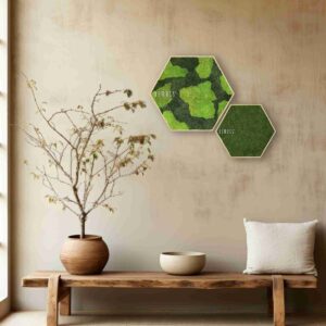 Machový obraz Hexagon FLATMOSS BOVINO je ideálnou voľbou pre tých, ktorí hľadajú kreatívny a inovatívny doplnok do svojho interiéru. Tento obraz, vyrobený ručne na Slovensku zo 100% prírodného stabilizovaného machu, ponúka skvelý spôsob, ako vniesť prírodu do moderného prostredia bez námahy. Je bezúdržbový, takže si môžete užívať jeho krásu bez potreby starostlivosti.
