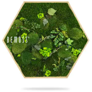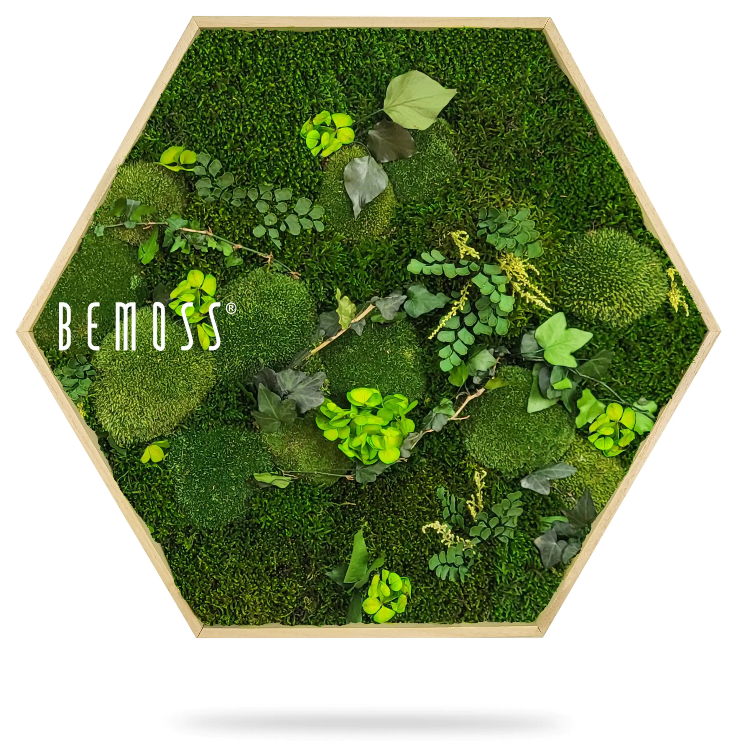 Machový Hexagon RASTLINY Mesia ponúka jedinečnú kombináciu prírody a dizajnu, ktorá obohatí každý interiér. Intenzívne zelené odtiene stabilizovaného machu sú doplnené sviežimi rastlinnými prvkami, vytvárajúc dojem lesnej oázy. Tento obraz je bezúdržbový, hypoalergénny a k dispozícii v rôznych rámových prevedeniach, aby dokonale zapadol do vášho priestoru.
