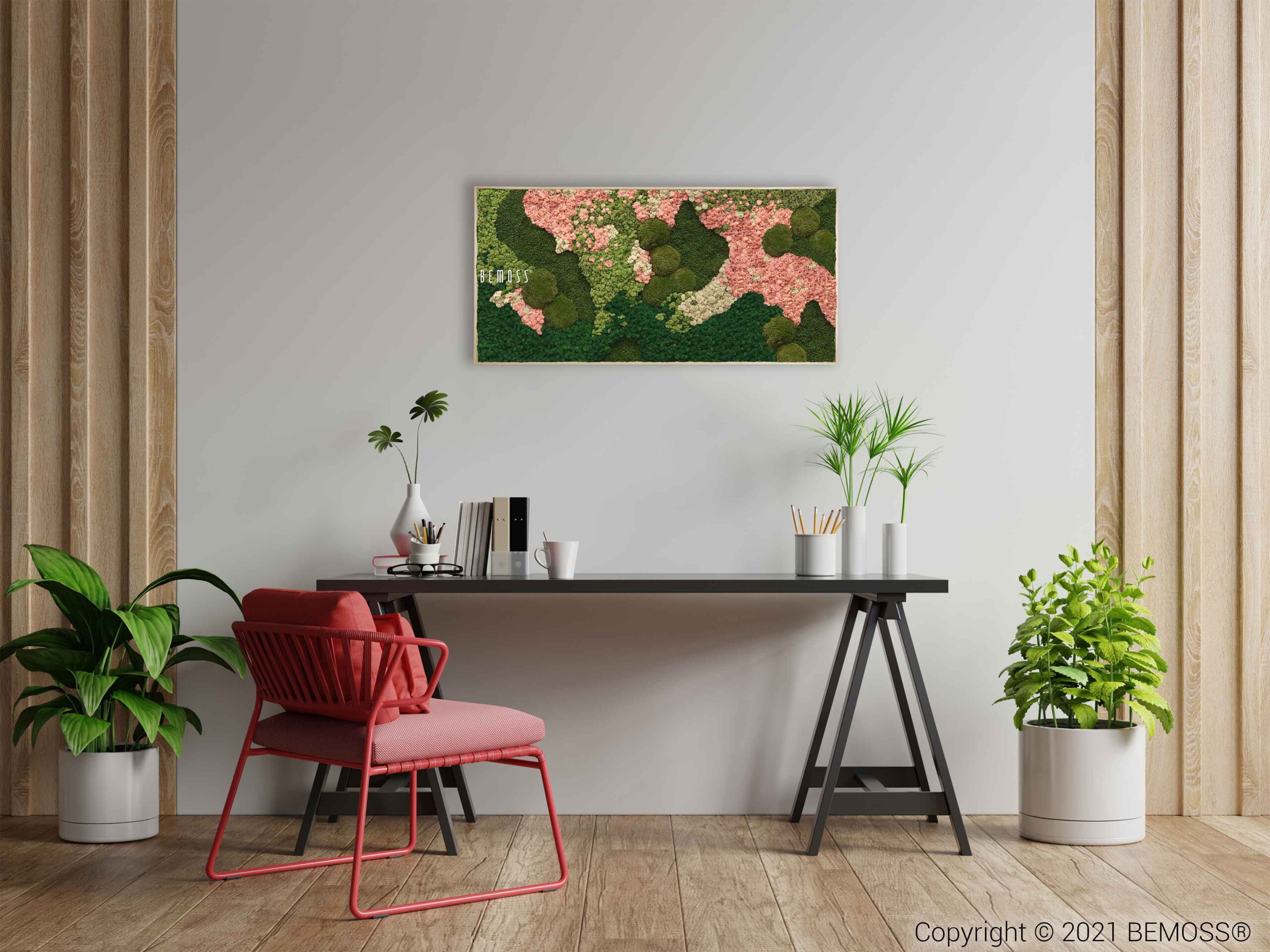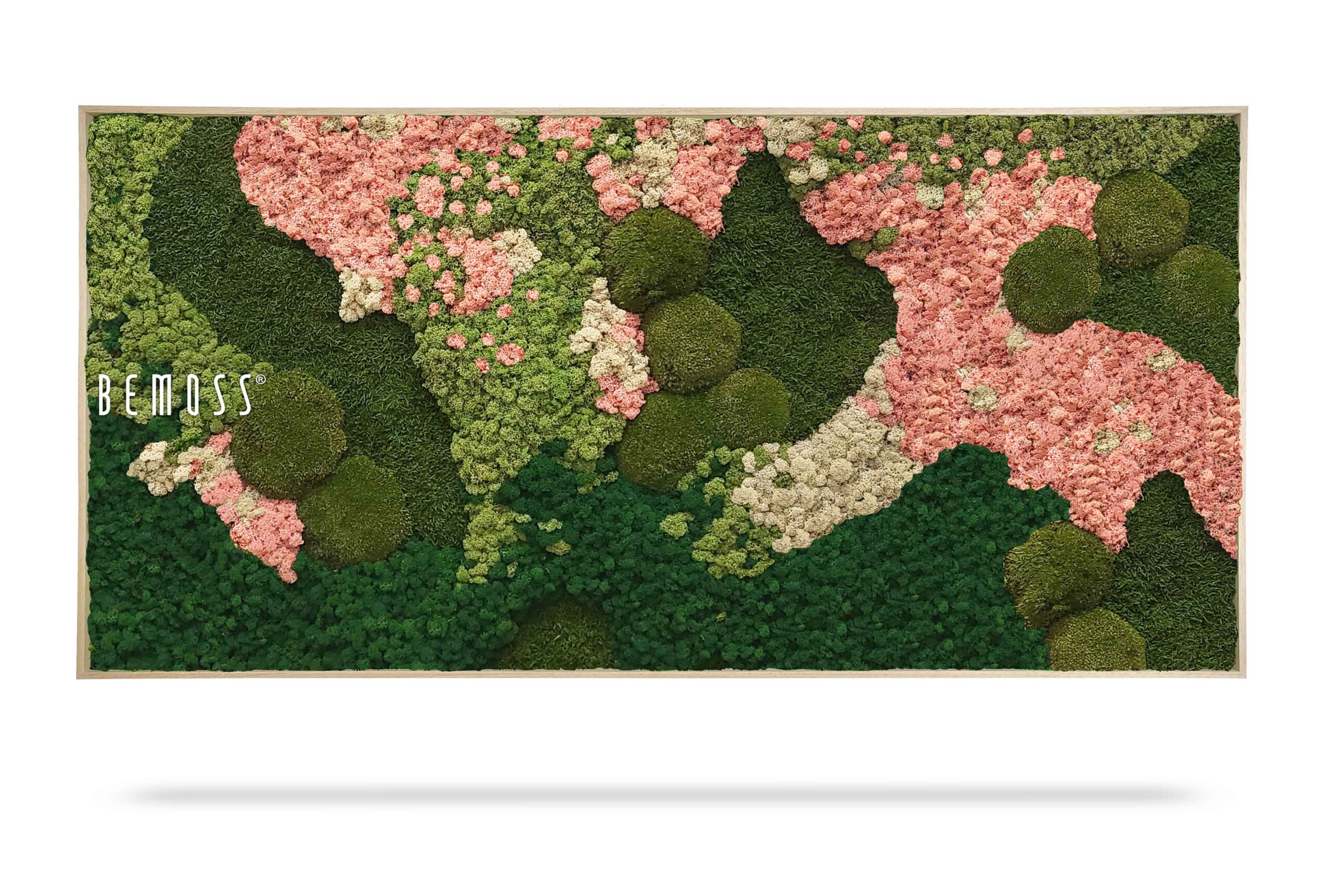 Machový obraz BEMOSS® ORTHO PINK je umelecké dielo, ktoré spája prírodnú krásu s moderným dizajnom. Kombinácia pastelovej ružovej, sviežich zelených odtieňov a jemných krémových tónov vytvára harmonickú kompozíciu, ktorá pripomína rozkvitnutú lúku. Organické tvary a textúry machu dodávajú obrazu jedinečný vzhľad, ktorý upúta pozornosť a zároveň vytvára pokojný a útulný dojem.