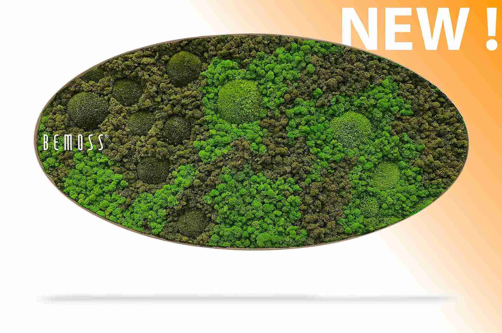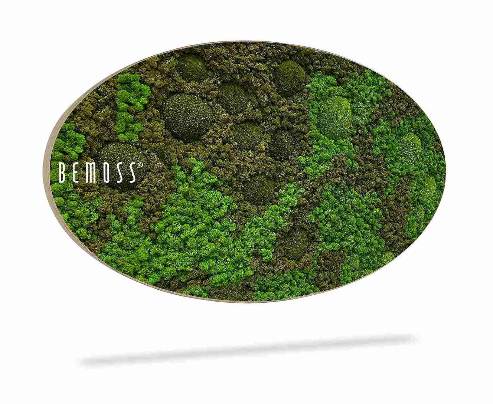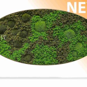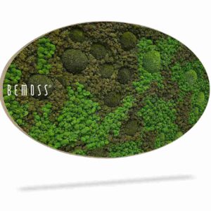 Machový obraz elipsa BEMOSS® ORTHO ASEL vyniká svojím elegantným, jemne zaobleným tvarom, ktorý do priestoru prináša pocit plynulosti a vizuálnej rovnováhy. Povrch obrazu tvorí pestrá kombinácia plochého a kopčekového machu, ktorá vytvára bohatý reliéf s prirodzenou hĺbkou. Striedanie rôznych odtieňov zelene spolu s detailnou textúrou evokuje autentický vzhľad lesného prostredia.
