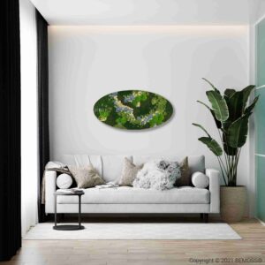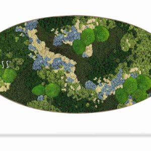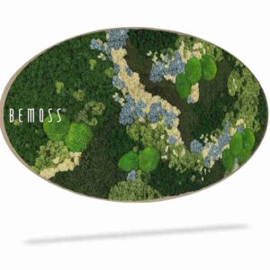 Machový obraz Elipsa BEMOSS® ORTHO ICE evokuje pokoj lesa zahaleného v rannom mraze. Prepletenie svetlých odtieňov stabilizovaného machu s jemnými bledomodrými tónmi vytvára harmonickú kompozíciu, ktorá očarí svojou originalitou. Tento bezúdržbový a ekologický obraz prináša prírodu priamo k vám, pričom si nevyžaduje žiadnu starostlivosť.