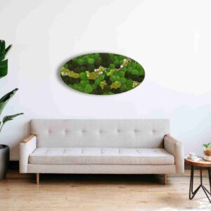 Machový obraz Elipsa BOLMOSS COSMO Lime je dokonalým spojením prírodnej krásy a nadčasového dizajnu. Svetlé a tmavé machové kopčeky dodávajú obrazu hĺbku, zatiaľ čo limetkové akcenty vnášajú do priestoru sviežosť a energiu. Krémové detaily vytvárajú harmonický kontrast, vďaka čomu obraz pôsobí príjemne a elegantne.