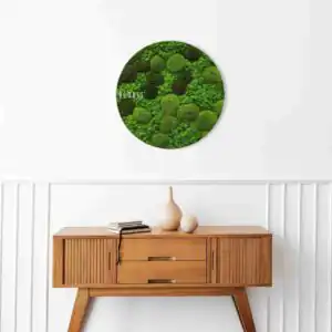 Vyrobený zo 100% prírodného stabilizovaného machu, tento obraz nepotrebuje polievanie, svetlo ani špeciálnu starostlivosť. Okrem estetickej hodnoty je aj hypoalergénny, ekologický a pomáha zlepšiť akustiku miestnosti, čím vytvára pohodlné a príjemné prostredie na oddych či prácu.
