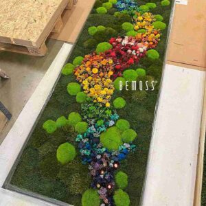 Machový obraz RASTLINY Acebo je oslavou prírody vo všetkých jej farbách. Bohaté zelené plochy stabilizovaného machu sú doplnené pestrou škálou farebných kvetov, ktoré vytvárajú pocit prechádzky kvetinovou lúkou. Kombinácia sýtej zelene s jemnými a výraznými tónmi kvetov oživí akýkoľvek priestor a prinesie doň hravosť a eleganciu.