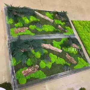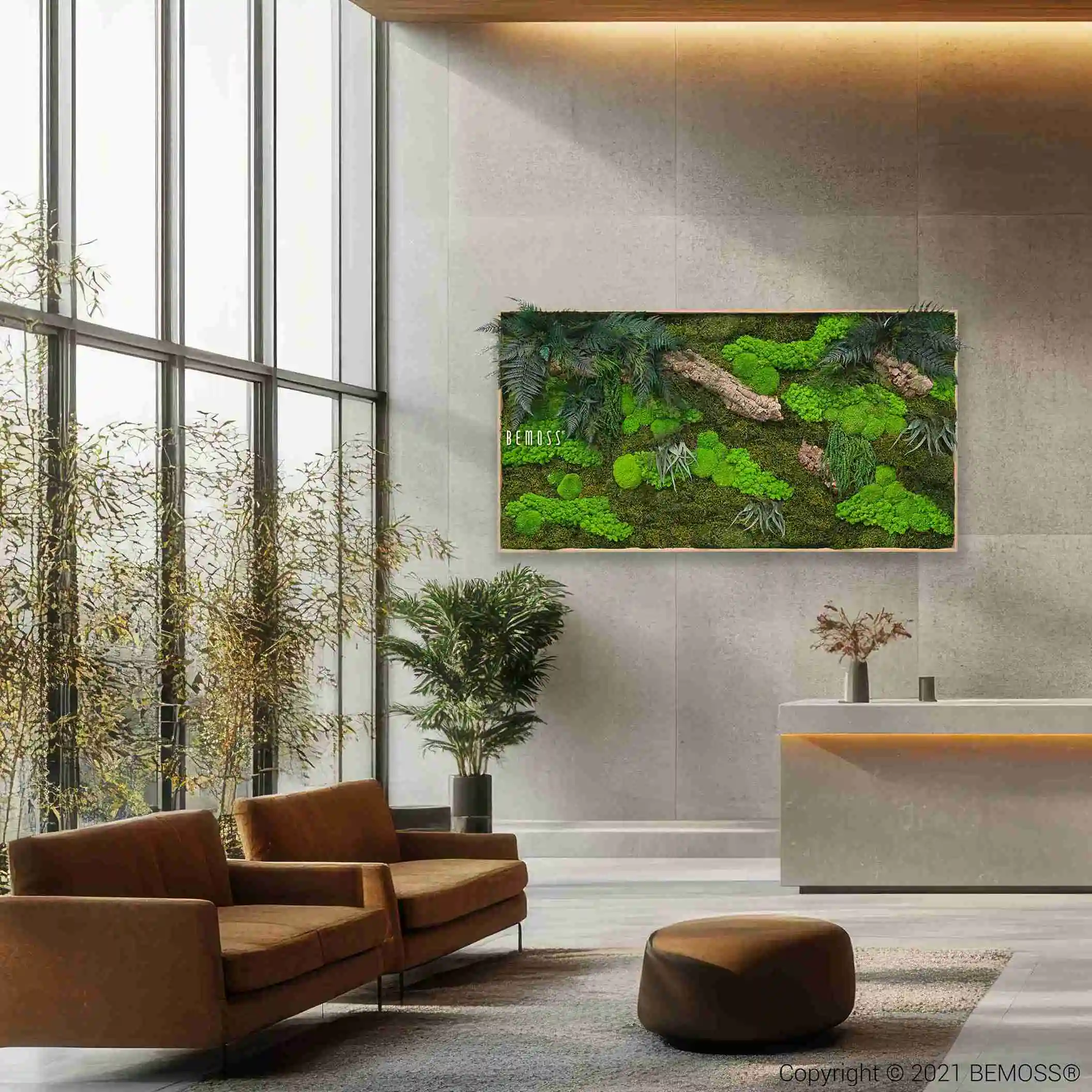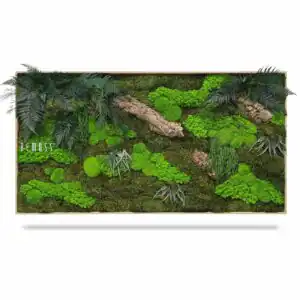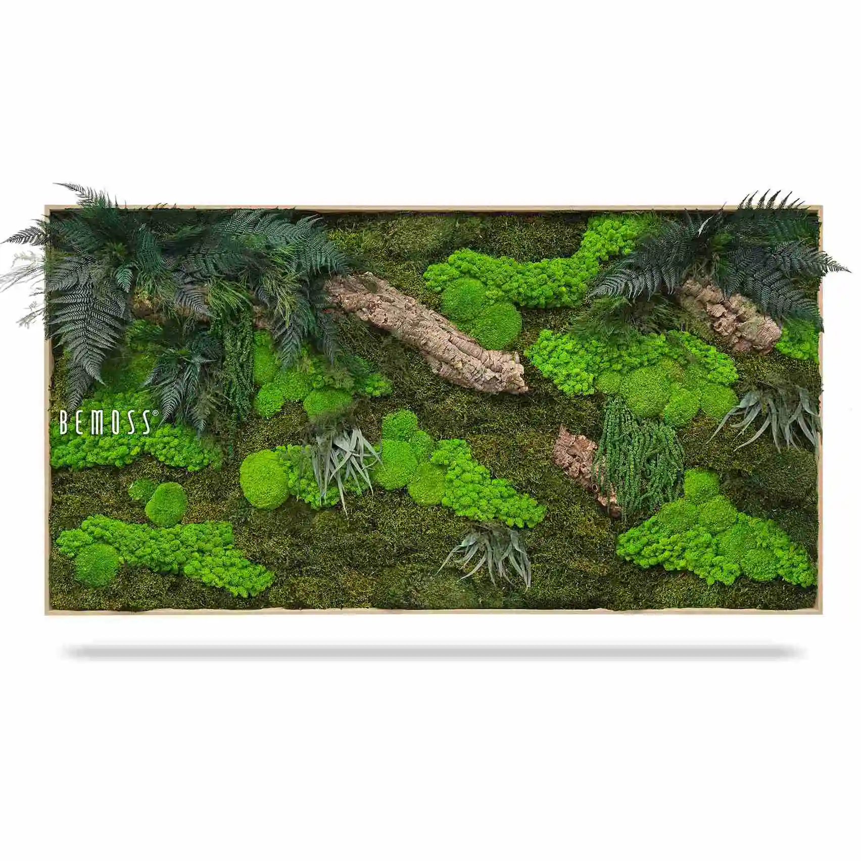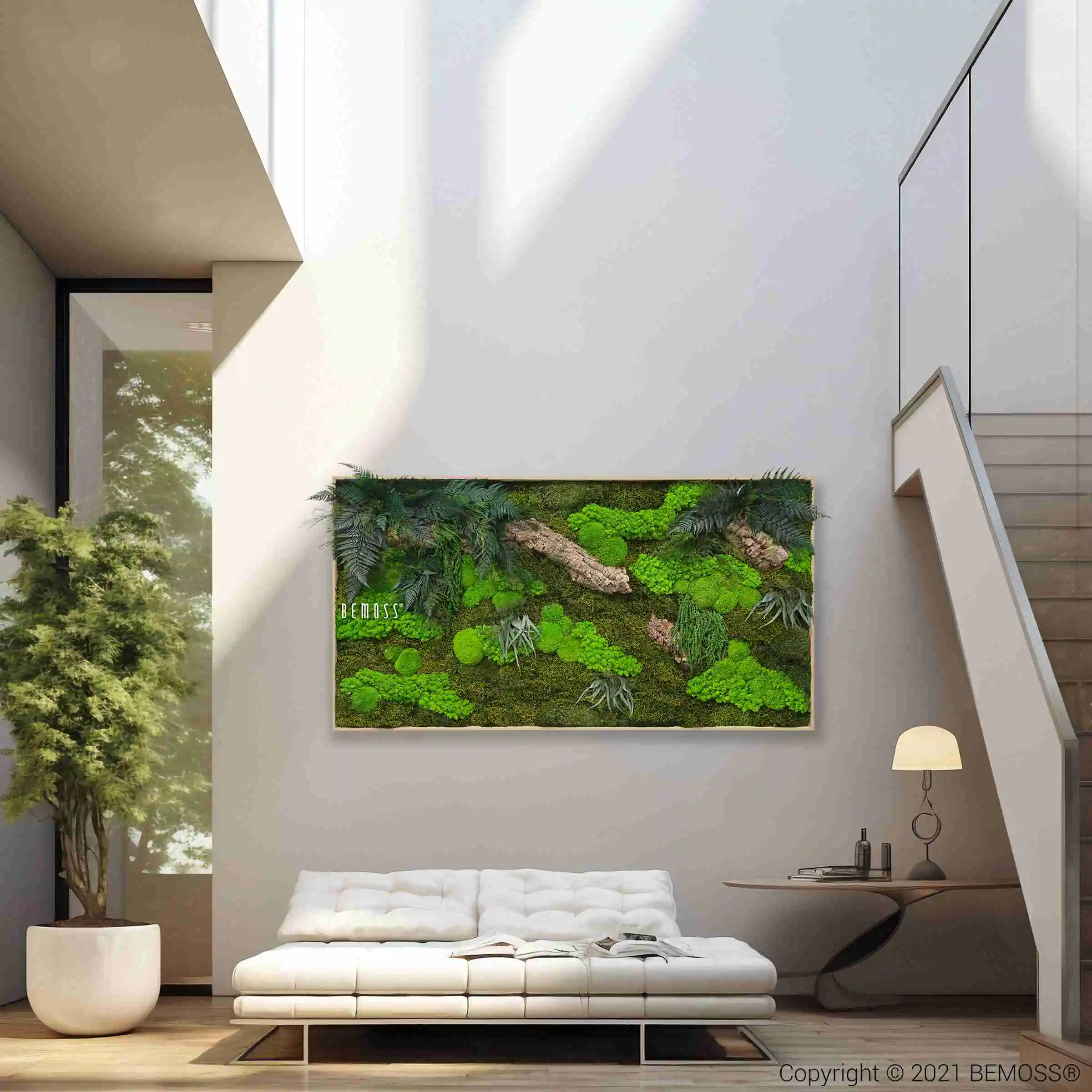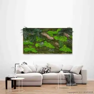 Vstúpte do prírody priamo vo vašom interiéri s machovým obrazom RASTLINY Alona XXL. Tento obraz je ručne vyrobený na Slovensku zo 100% prírodného stabilizovaného machu a je bezúdržbový, čo vám umožní bez námahy užívať si krásu prírodného dizajnu. Zelené plochy machu sa plynulo striedajú s tmavšími odtieňmi, pričom prírodné detaily ako drevené kúsky a jemné rastliny vnášajú do miestnosti dynamiku lesa.