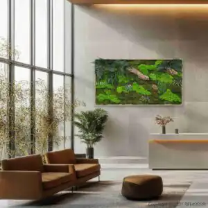 V popredí obrazu nájdeme nádherne usporiadané kúsky dreva, ktoré prirodzene splývajú s machovými plochami, čím sa z obrazu stáva vizuálny zážitok. K tomu sa pridávajú jemné rastliny, ktoré obraz oživujú a robia ho ešte pútavejším. Tieto prírodné prvky spolu vytvárajú organickú harmóniu, ktorá prináša do miestnosti relax a kontakt s prírodou.