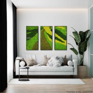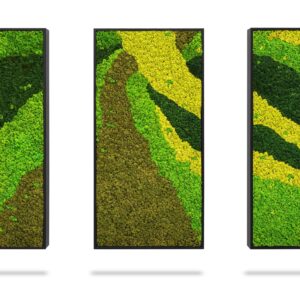 Machový set BEMOSS® ORTHO CARROT v odtieňoch zelenej a žltej je ručne vyrobený na Slovensku zo stabilizovaného machu. Tento ekologický a bezúdržbový produkt s výbornými akustickými vlastnosťami je dostupný v rôznych rozmeroch a s rámami podľa vášho výberu. Je skvelým doplnkom pre moderné interiéry.